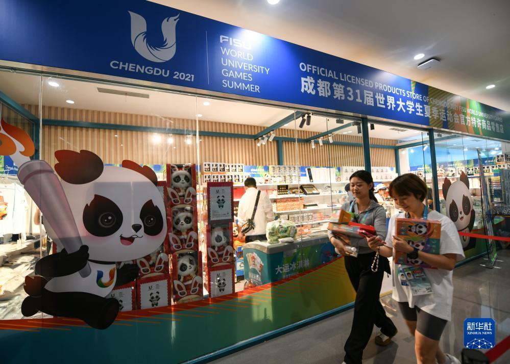 7月13日,在成都大運會主媒體中心官方特許商品零售店,部分工作人員和媒體記者選購商品后離開。