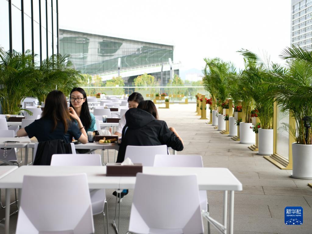 7月14日,媒體工作人員在成都大運會主媒體中心媒體餐廳室外就餐區就餐。
