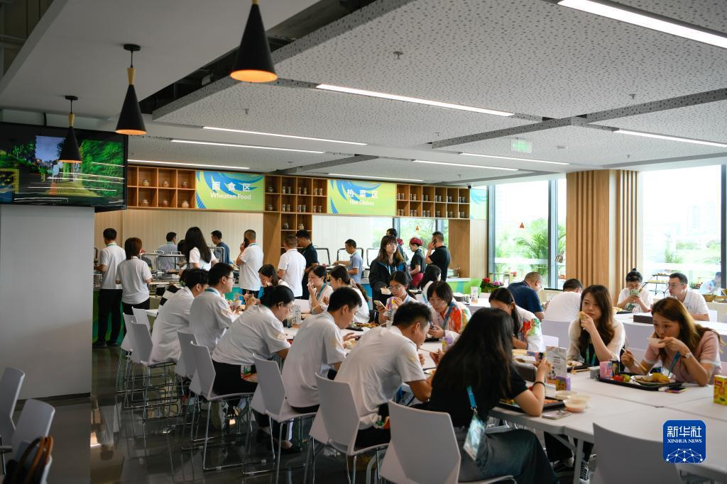 7月14日,媒體工作人員在成都大運會主媒體中心媒體餐廳內就餐。