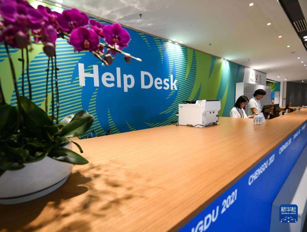 7月13日,在成都大運會主媒體中心,工作人員正在服務臺工作。