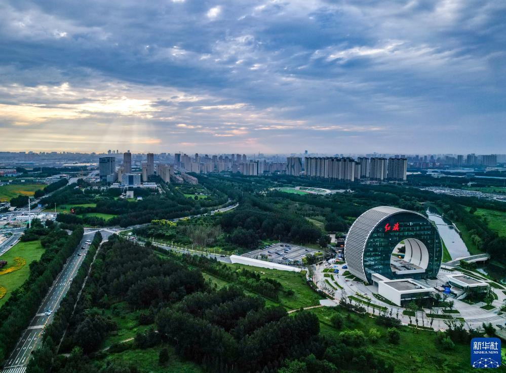 7月13日無人機拍攝的晨曦中的一汽紅旗創新大廈。