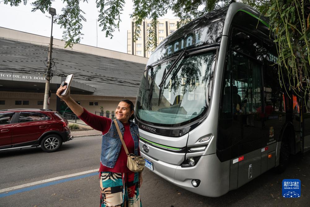 7月12日,在巴西圣保羅州圣若澤杜斯坎普斯,游客與比亞迪純電動大巴合影。