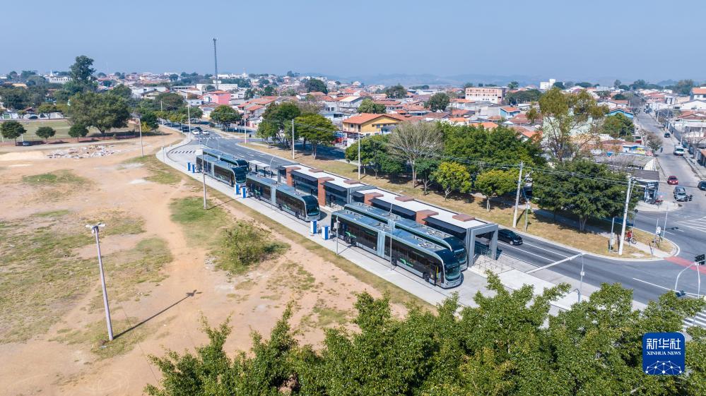 這是7月12日在巴西圣保羅州圣若澤杜斯坎普斯快速公交系統“綠線”始發站拍攝的比亞迪純電動大巴(無人機照片)。