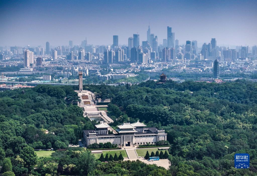南京雨花臺烈士陵園與城市景色(無人機照片,6月9日攝)。