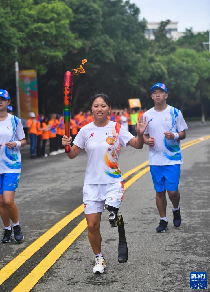 7月14日,火炬手陳憶梅在火炬傳遞中。