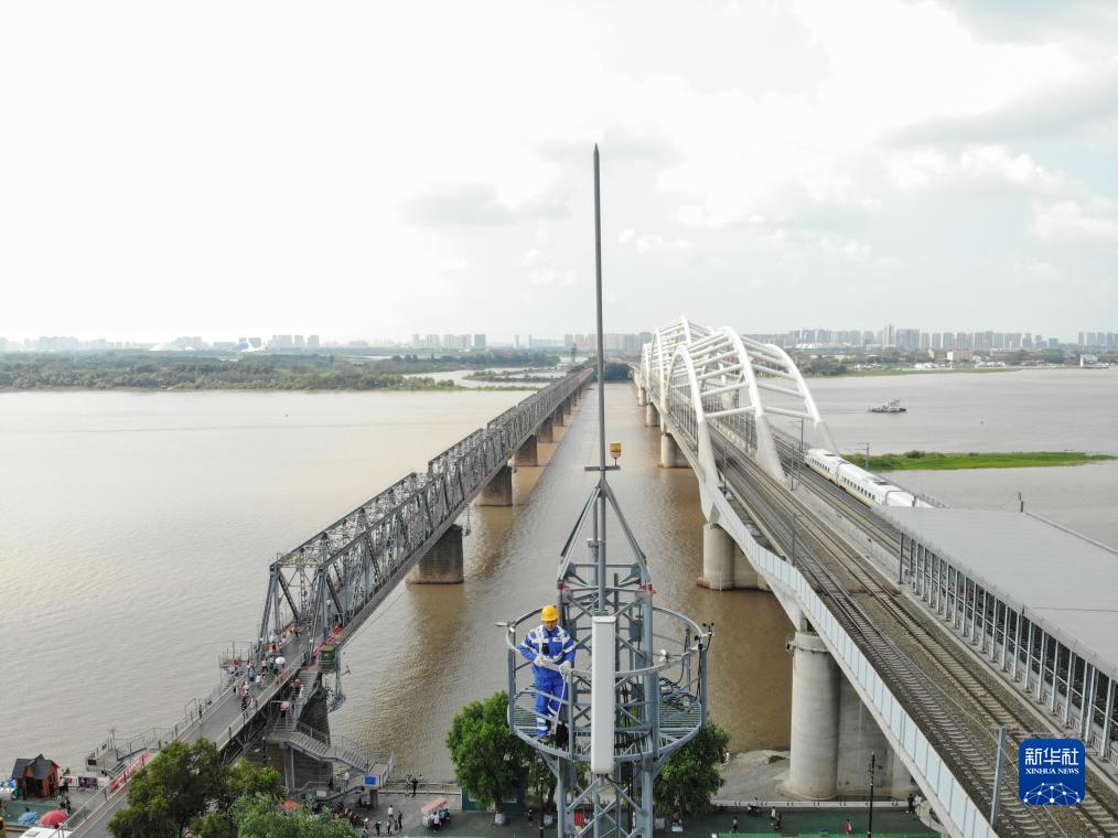 7月11日,在哈齊高鐵1號基站鐵路通信鐵塔上,魏巍進行維護鐵路通信設備作業(無人機照片)。