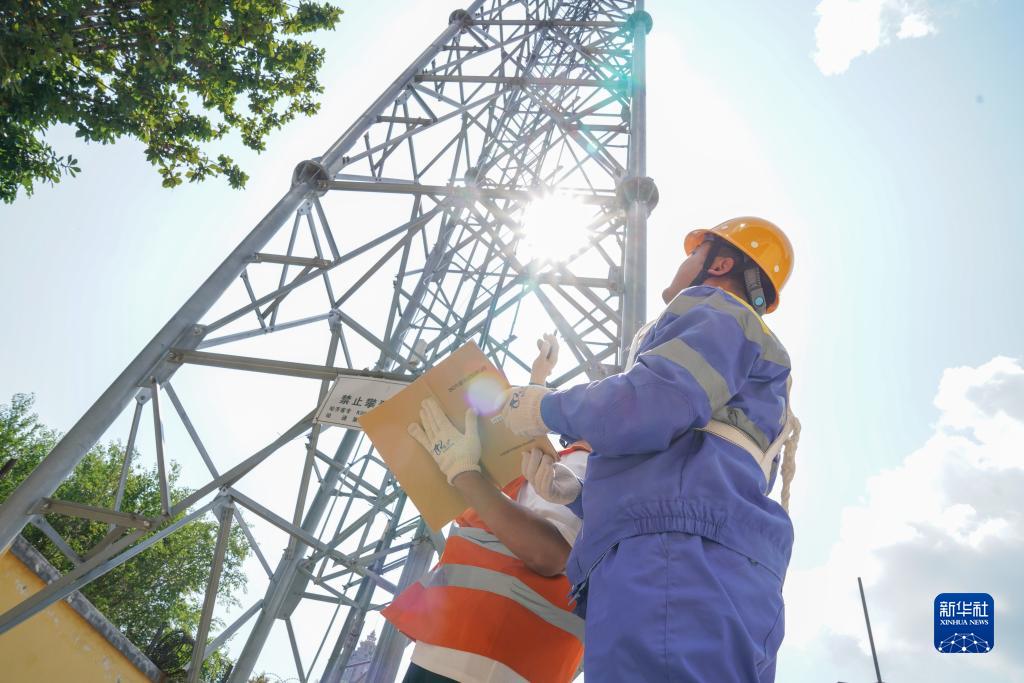 7月11日,在哈齊高鐵1號基站,魏?。ㄓ遥┰谏纤芭c防護員曹學明確認作業要點。
