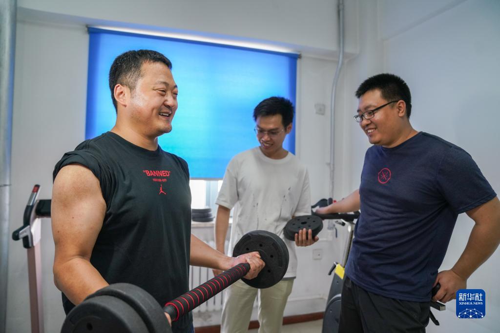 7月13日,在哈爾濱通信段哈北通信車間活動室,魏?。ㄗ螅┡c同事在工閑時進行鍛煉?;捐F塔爬梯外側安裝了防墜落的半圓球籠,身材過胖鉆不進去,身材過瘦力量不足爬不上去,作業人員需要常年保持穩定的體重和核心力量。