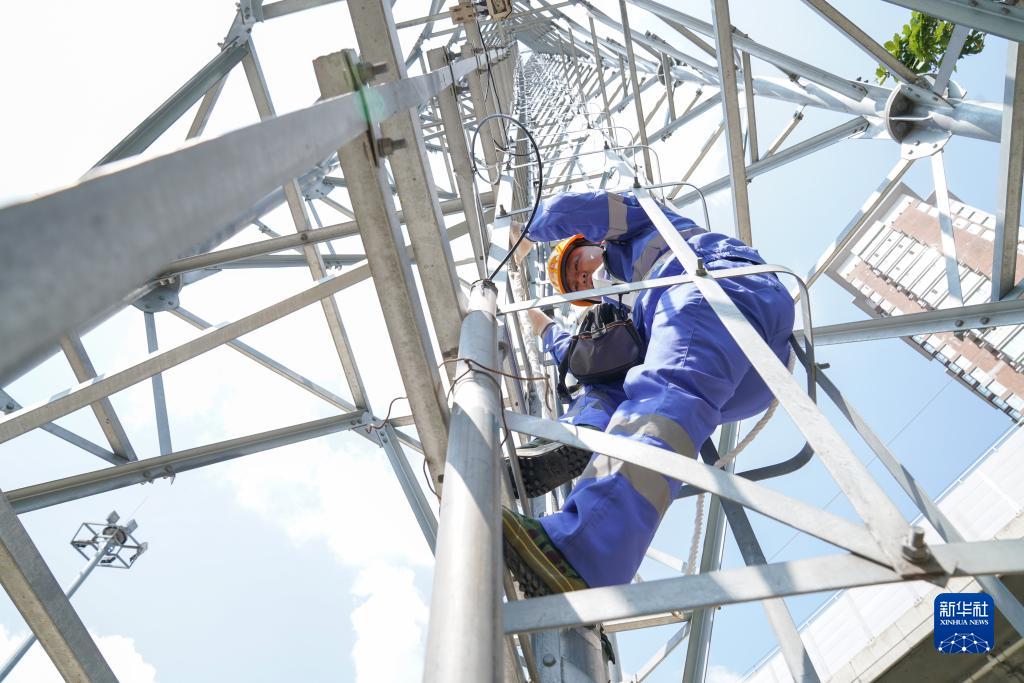 7月11日,在哈齊高鐵1號基站,魏巍在攀爬鐵塔。