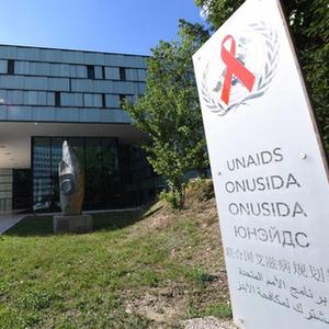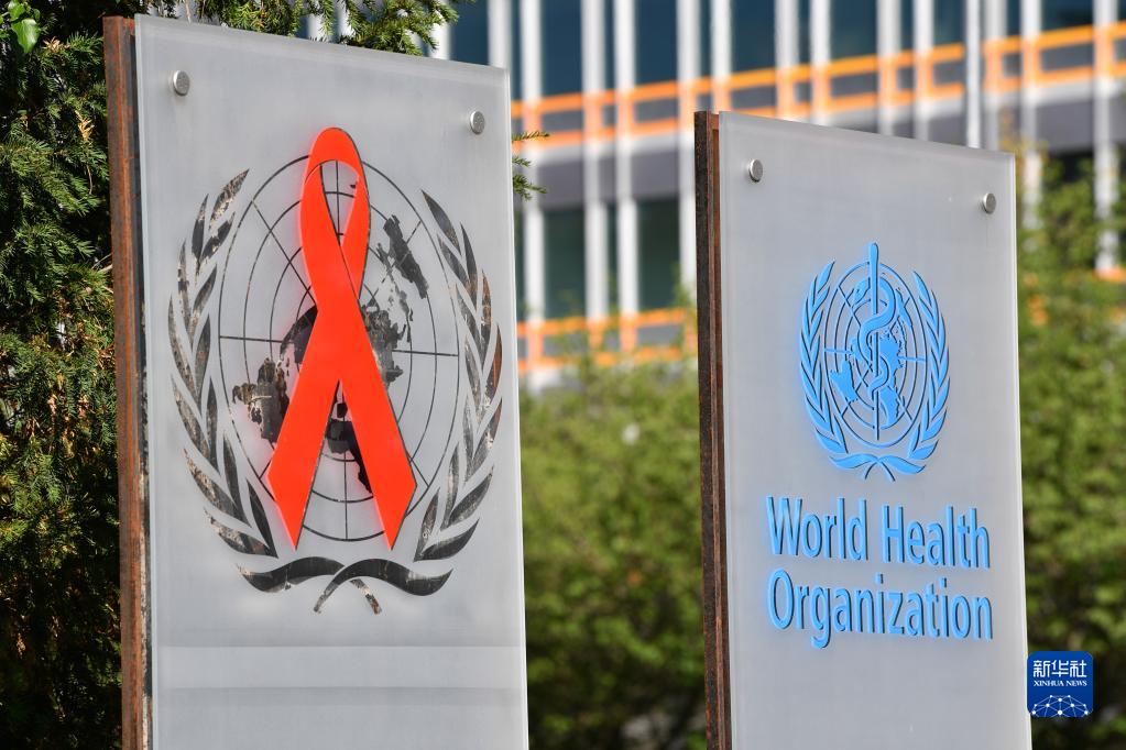 這是7月13日在瑞士日內瓦聯合國艾滋病規劃署總部拍攝的聯合國艾滋病規劃署(左)和世界衛生組織標識。
