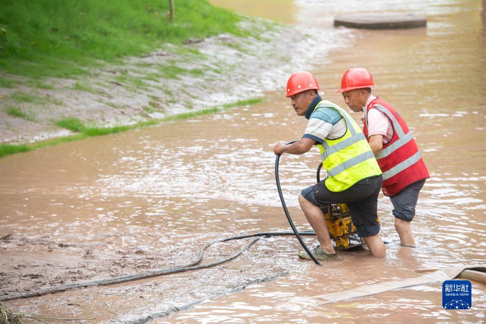 7月14日,在重慶市萬州區江南新區,救援人員進行排水搶險作業。