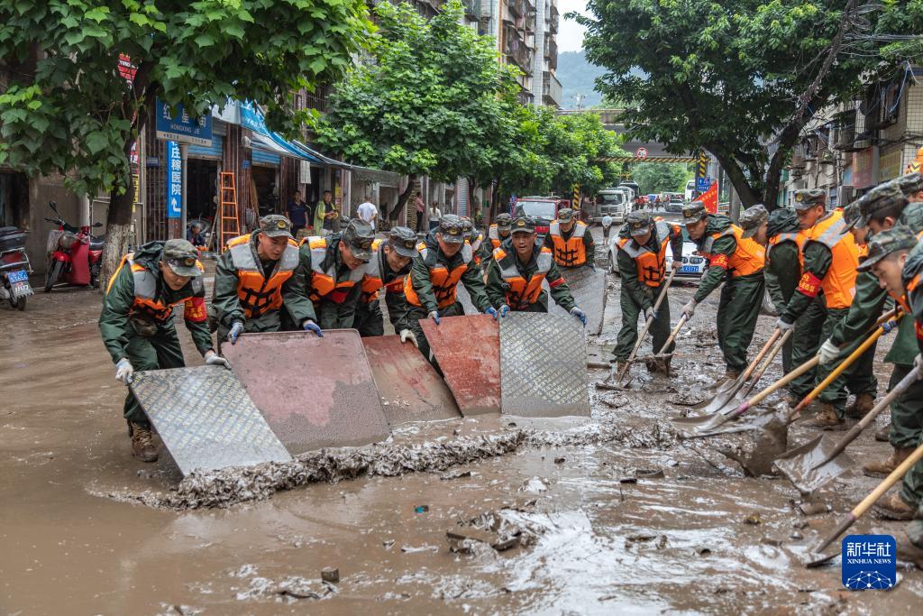 7月14日,在重慶市萬州區五橋街道五間橋社區,武警重慶總隊船艇支隊官兵在洪水退去后清淤。