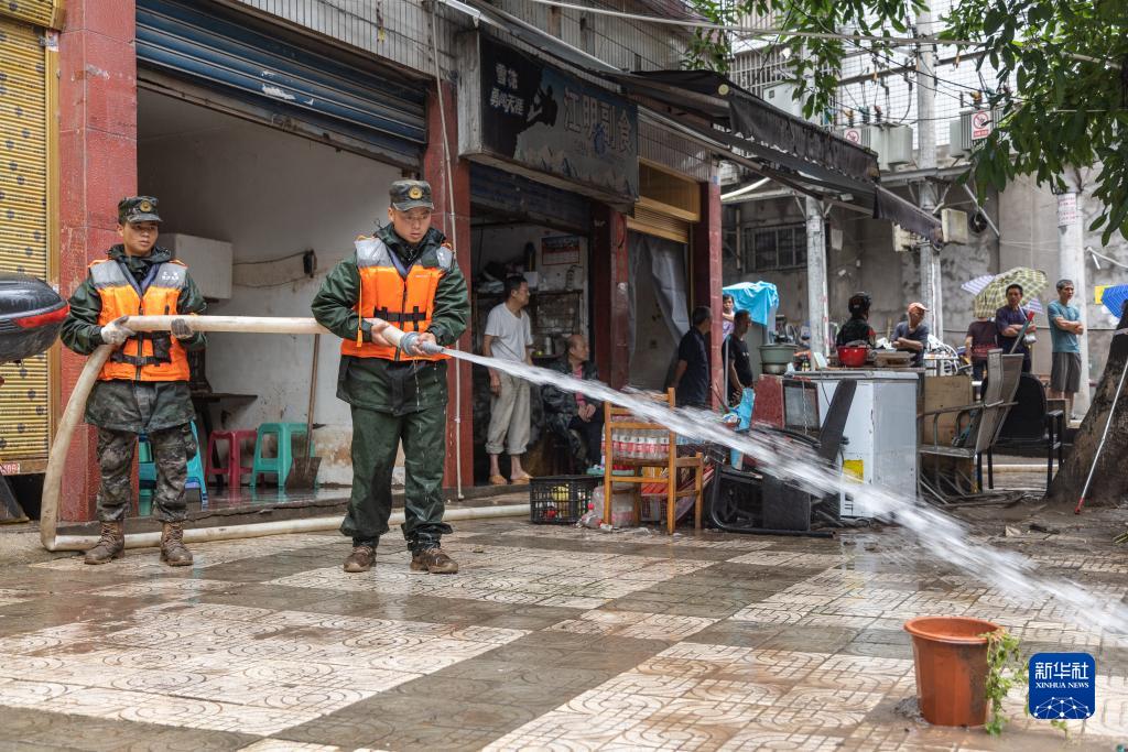 7月14日,在重慶市萬州區五橋街道五間橋社區,武警重慶總隊船艇支隊官兵在洪水退去后沖洗地面。