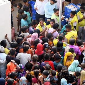 連續強降雨導致亞穆納河水位上漲,新德里部分地區被淹,市民出行和日常生活受到影響,低洼區受災居民排隊領取生活物資。
