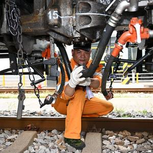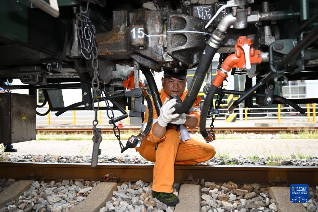 7月13日,合肥火車站運轉車間調車長李健在連接調車機車與車輛制動軟管。