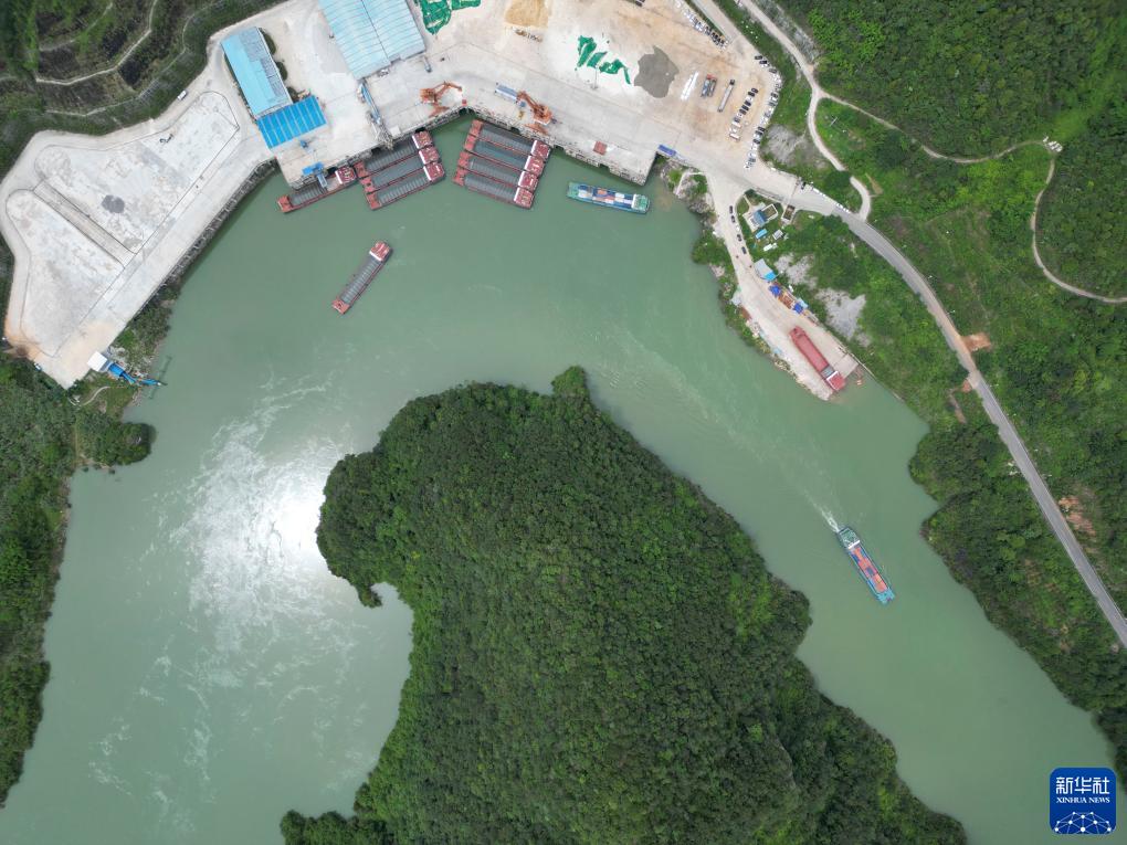 集裝箱貨輪從貴州省遵義市余慶縣沙灣碼頭陸續駛出(7月14日攝,無人機照片)。