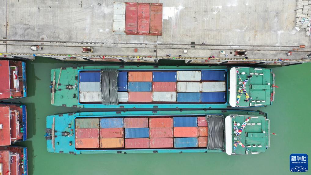 集裝箱貨輪在貴州省遵義市余慶縣沙灣碼頭整裝待發(7月14日攝,無人機照片)。