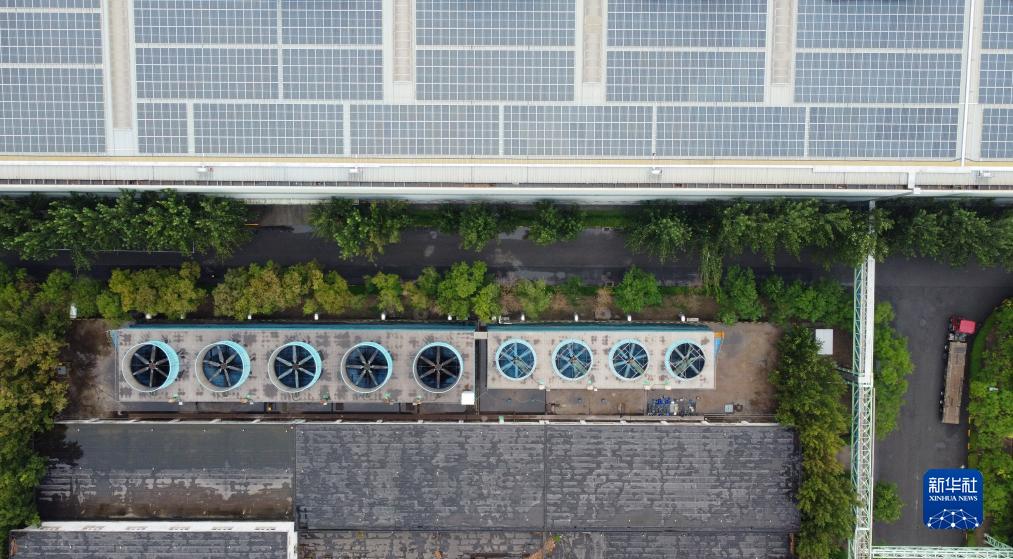 天津市新天鋼鋼鐵集團有限公司廠區屋頂安裝有太陽能光伏板(7月12日攝,無人機照片)。