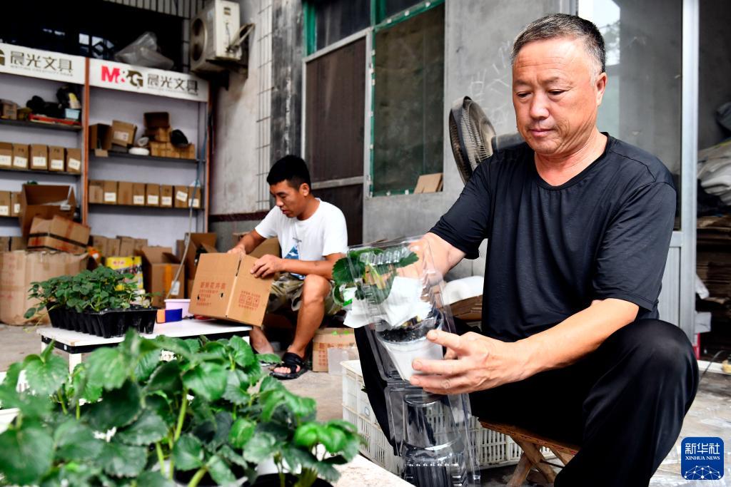 7月14日,在惠民縣石廟鎮柳編彭村,村民打包草莓苗,準備發快遞物流。