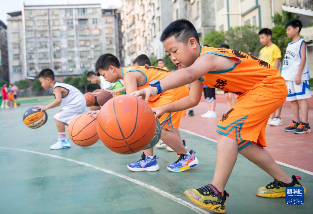 7月14日,在湖南省永州市道縣樹湘學校運動場,孩子們參加籃球訓練。