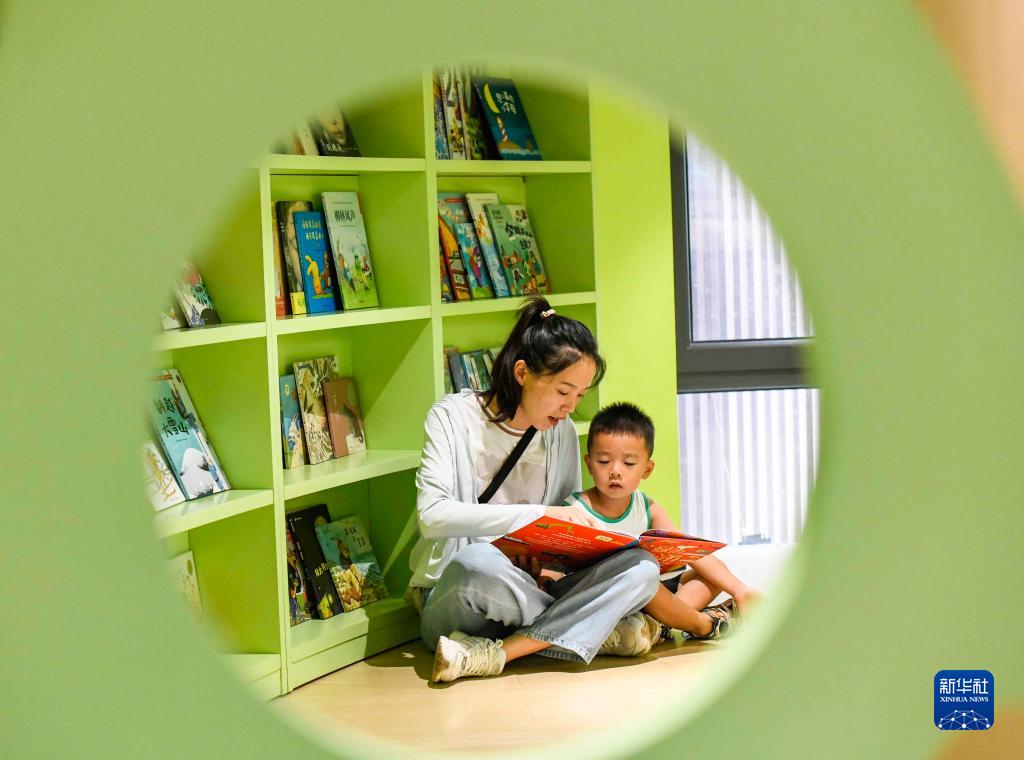 7月14日,家長陪伴小朋友在河北省遵化市新華書店閱讀書籍。