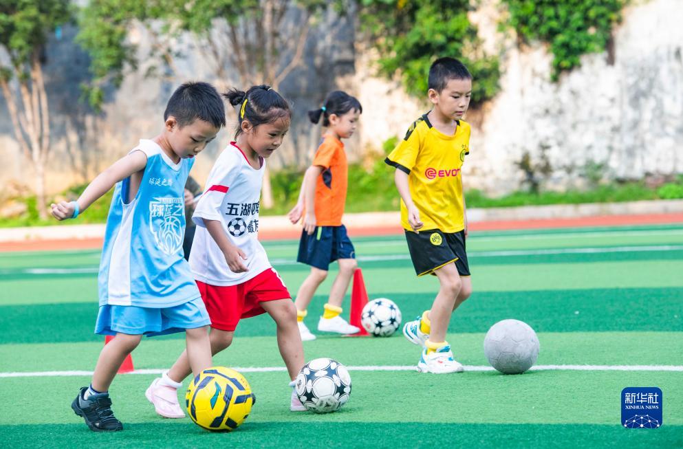 7月14日,在湖南省永州市道縣樹湘學校運動場,孩子們參加足球訓練。
