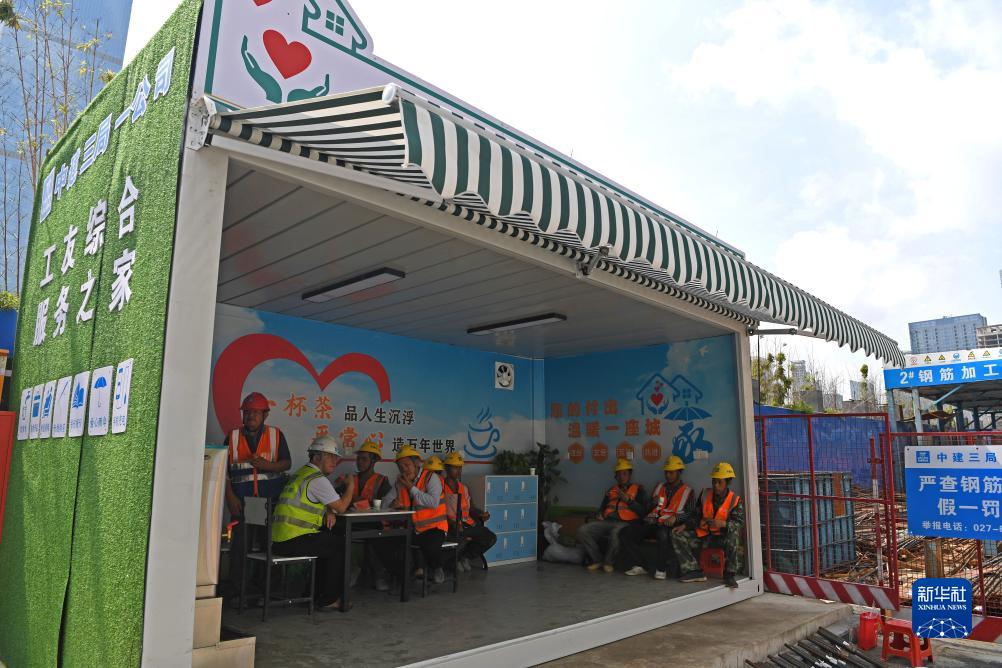 7月14日,幾名工人在南寧中銀金融中心項目建設工地工友綜合服務之家小憩。
