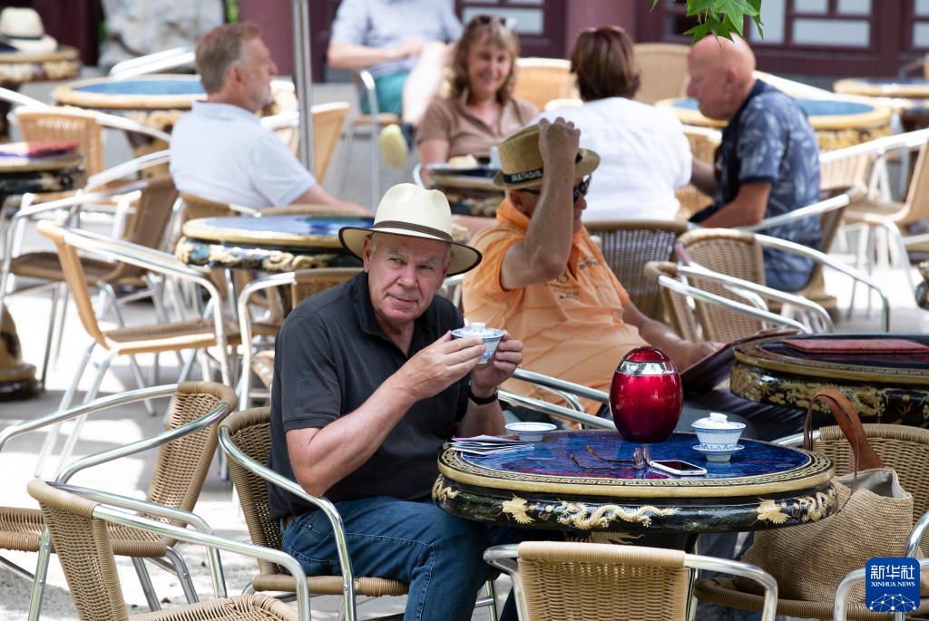 7月14日,在德國曼海姆的路易森公園內的中國園林“多景園”,游客在茶樓喝茶。