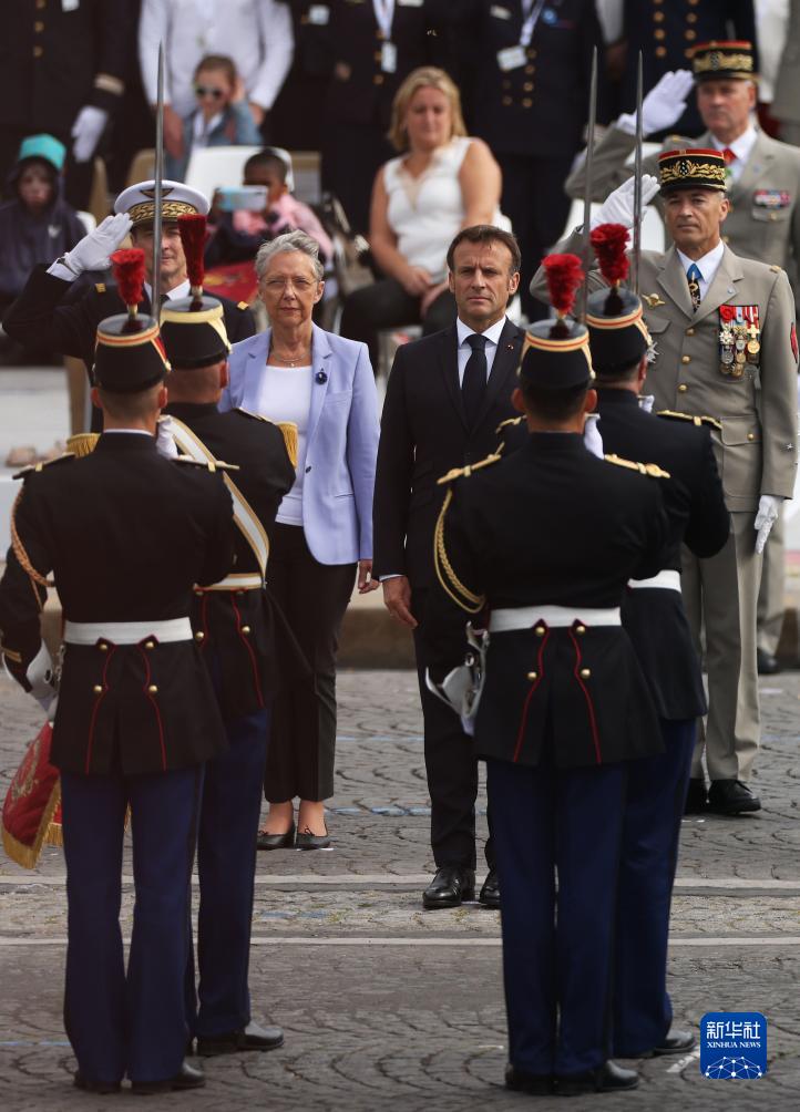 7月14日,法國總統馬克龍(中右)和總理博爾內在巴黎協和廣場的國慶閱兵式現場檢閱儀仗隊。新華社記者 高靜 攝