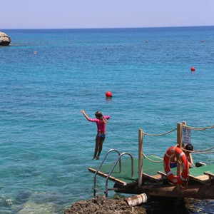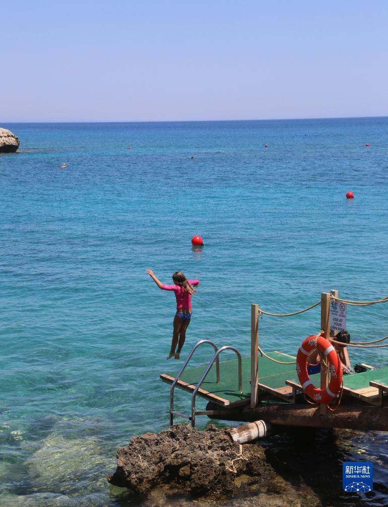 7月14日,在塞浦路斯普羅塔拉斯的一處海灘,一名小姑娘跳入海中消暑。