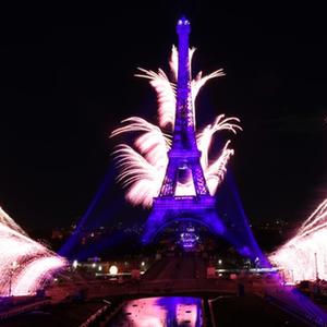 7月14日,焰火在法國巴黎埃菲爾鐵塔周圍綻放。