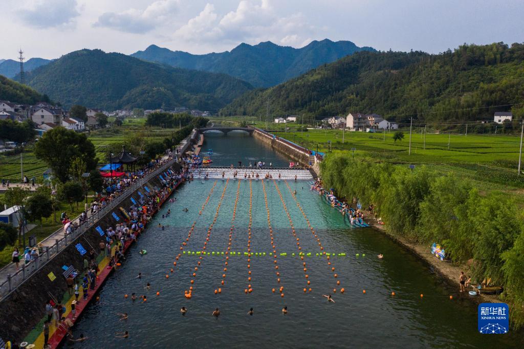 7月14日傍晚,“喜迎亞運·悅動乾潭”2023乾潭胥溪清涼季——下包戲水節在浙江省建德市乾潭鎮下包村胥溪天然泳場開啟,近千名市民和游客前來戲水休閑。