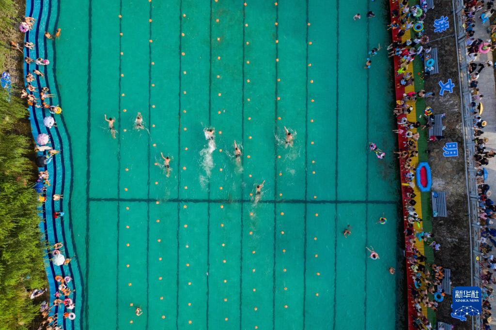 7月14日,村民在乾潭鎮下包村胥溪天然泳場參加趣味比賽(無人機照片)。