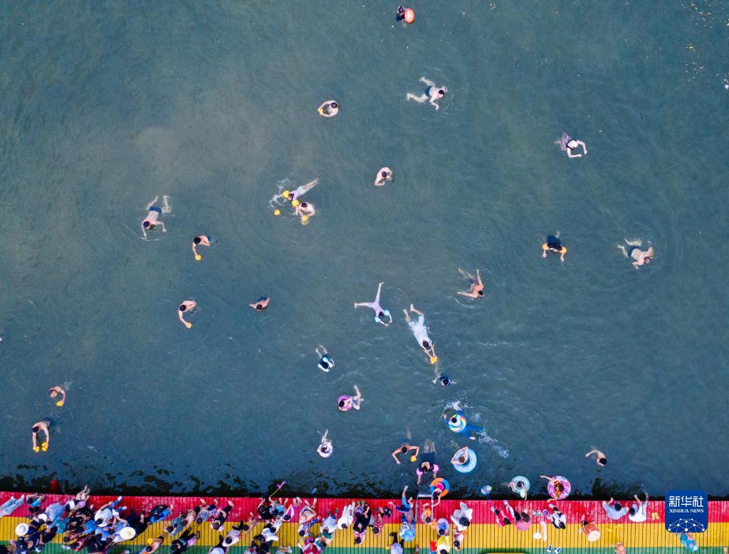 7月14日,游客和村民在乾潭鎮下包村胥溪天然泳場戲水,感受夏日清涼(無人機照片)。