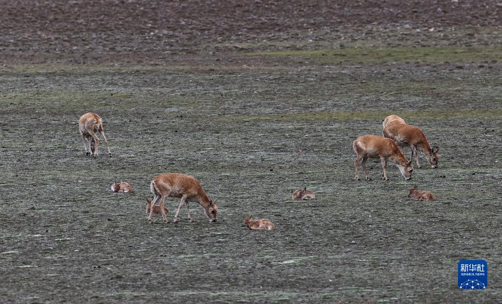 7月8日,在新疆阿爾金山國家級自然保護區兔子湖地區,藏羚羊媽媽照顧幼崽。