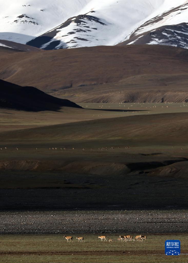 這是7月9日在新疆阿爾金山國家級自然保護區兔子湖地區拍攝的藏羚羊媽媽和幼崽。