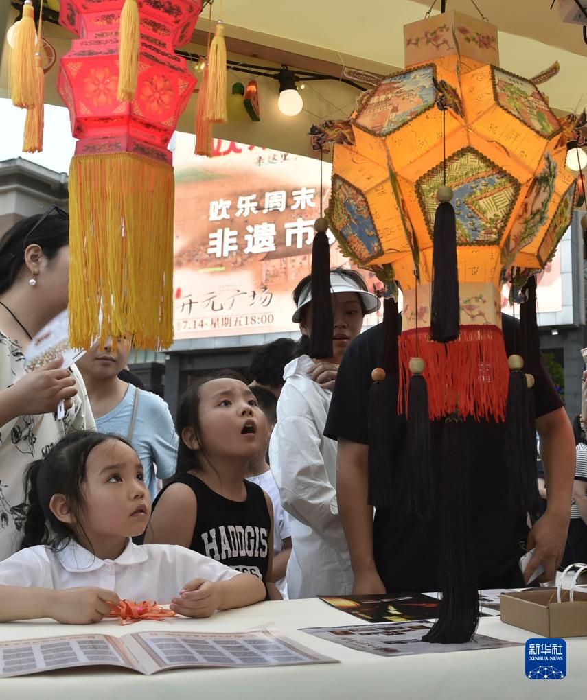 7月14日傍晚,小朋友在開封市開元廣場設立的“非遺市集”現場觀看傳統彩燈制作。