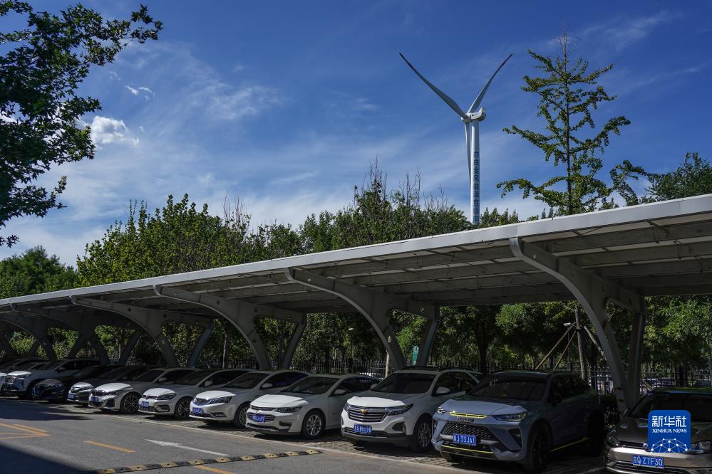 7月14日拍攝的配有光伏設備的停車區,遠處是風力發電設備。
