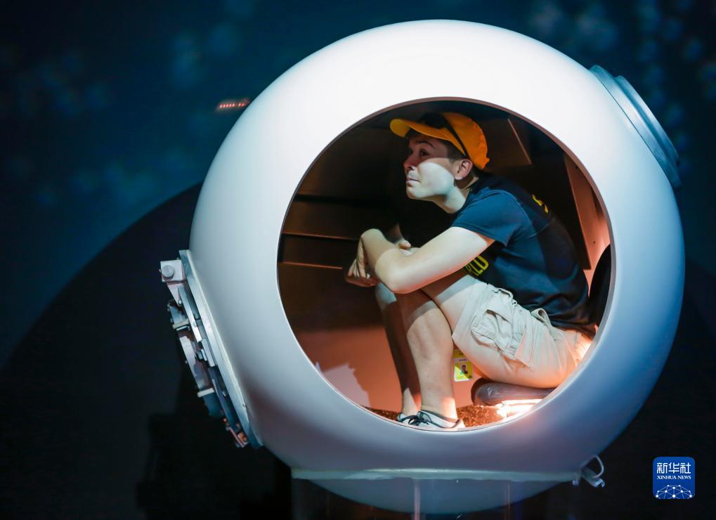 7月10日,在加拿大溫哥華舉辦的“挑戰深?!睂n}展上,參觀者體驗“深海挑戰者”號載人潛水器的圓形駕駛室。