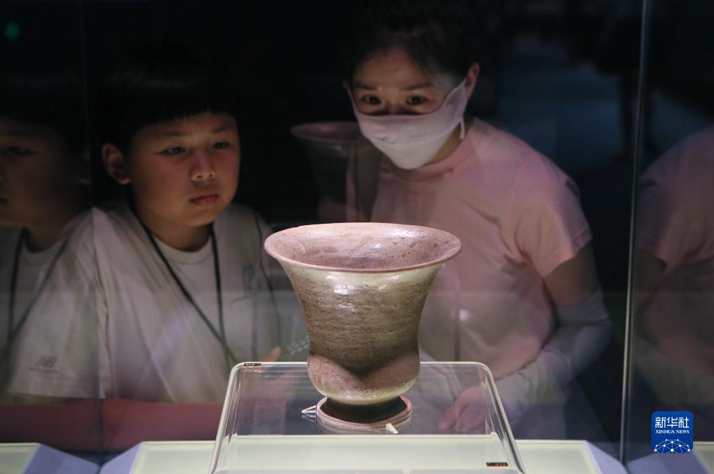 7月14日晚,參觀者在上海博物館的中國古代陶瓷館觀看青釉弦紋尊。