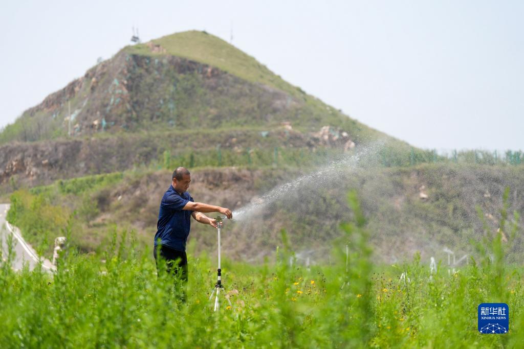 7月14日,工人在河北省唐山市古冶區一處礦山修復區內檢修噴灌設施。