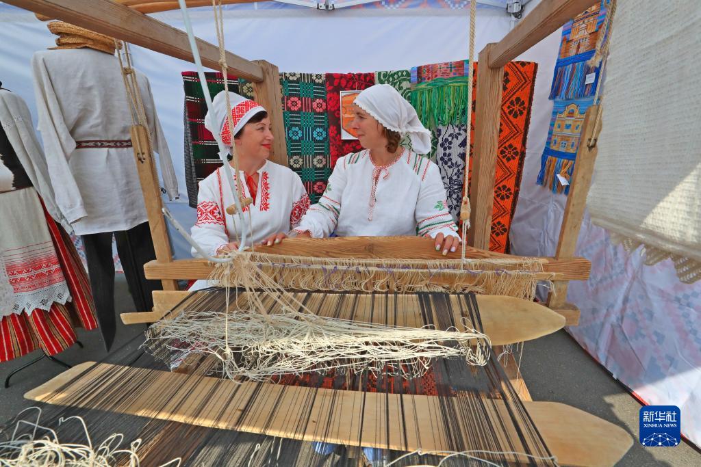 7月14日,參展人員在白俄羅斯維捷布斯克“斯拉夫巴扎”國際藝術節上演示傳統織布。