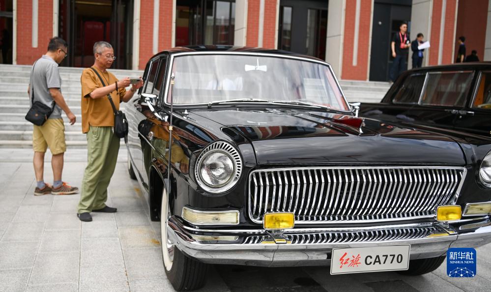 7月15日,市民在位于吉林長春的紅旗會堂前觀賞展出的紅旗汽車。