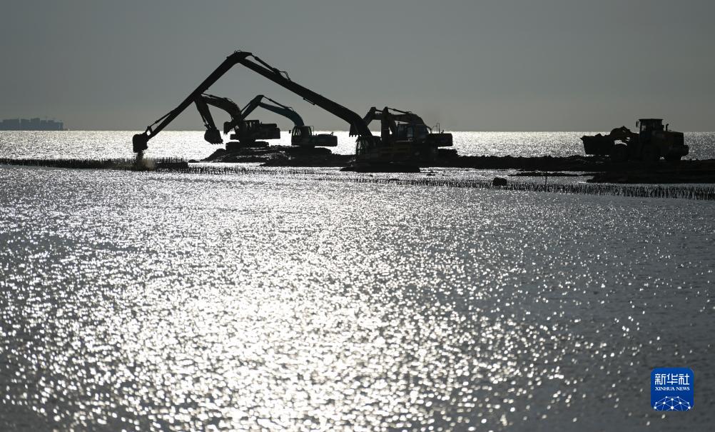 7月14日,工人在文昌鋪前中心漁港項目施工。