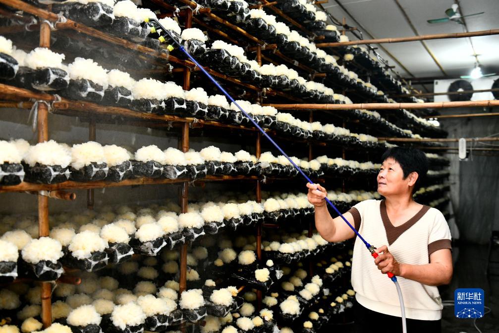 7月15日,在惠民縣胡集鎮銀豐食用菌種植合作社,工作人員在菇棚里為銀耳噴水。