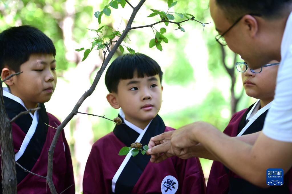 7月15日,參加中醫藥文化主題夏令營的小學生在野外了解中藥蟬蛻。