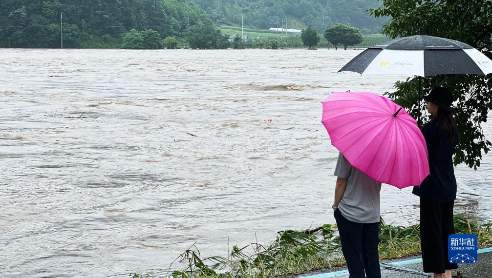 7月15日,在韓國忠清北道槐山郡,市民望著洪水。