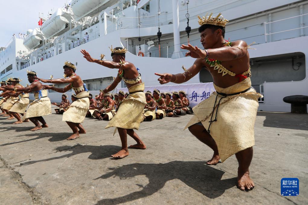 7月15日,中國海軍“和平方舟”號醫院船抵達基里巴斯塔拉瓦,當地民眾表演特色舞蹈歡迎“和平方舟”號來訪。