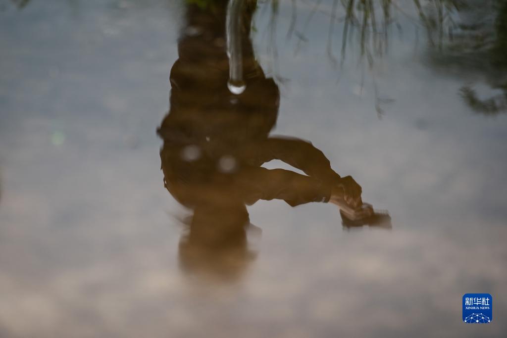 7月13日,尹銘燕在進行射擊訓練,地面的水洼映出她的倒影。