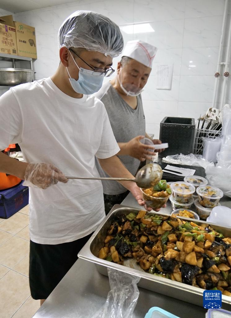 7月13日,東城區北新橋街道海運倉養老服務驛站的廚師在給老人盛飯菜,準備送餐上門。